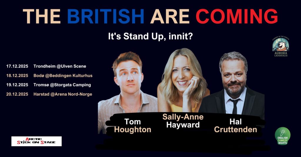Join Tom Houghton, Sally-Anne Hayward, and Hal Cruttenden as they bring a blizzard of British humour to Norway. These comedy powerhouses have graced TV screens, royal halls, and questionable hotel breakfasts all over the world… and now they’re braving the Arctic Circle.